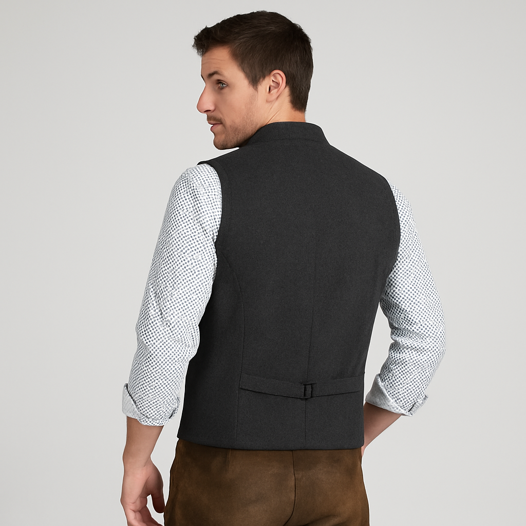 Die Weste Carl ist auf langlebigen Tragekomfort ausgelegt und vereint Vintage-inspirierte Ästhetik mit einer modernen, taillierten Silhouette. Die geknöpfte Vorderseite und die dezenten Akzente verleihen ihr einen eleganten und eleganten Look, egal ob zu Lederhose oder Jeans.