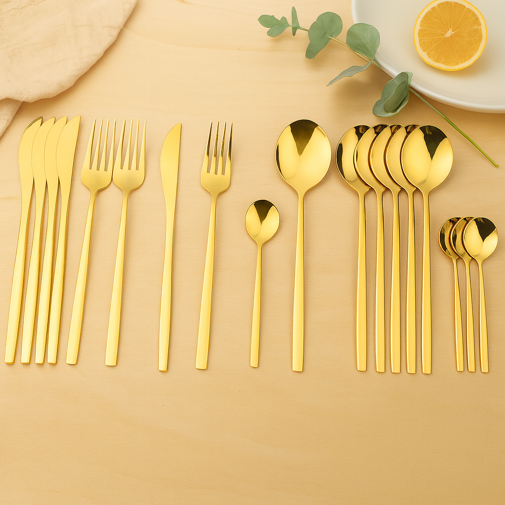 • Komplette 24-teilige Kollektion – Beinhaltet Tafelmesser, Gabeln, Löffel und Teelöffel.