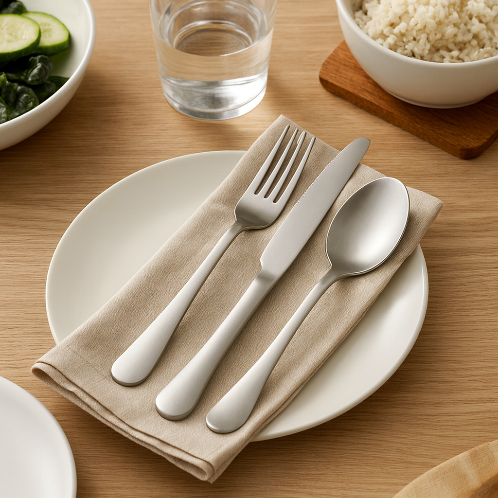 Dieses 30-teilige Edelstahl-Besteckset enthält Gabeln, Messer und Löffel für sechs Personen. Mit polierter Spiegeloberfläche und spülmaschinenfestem Design sorgt es für Eleganz und Komfort bei täglichen Mahlzeiten.