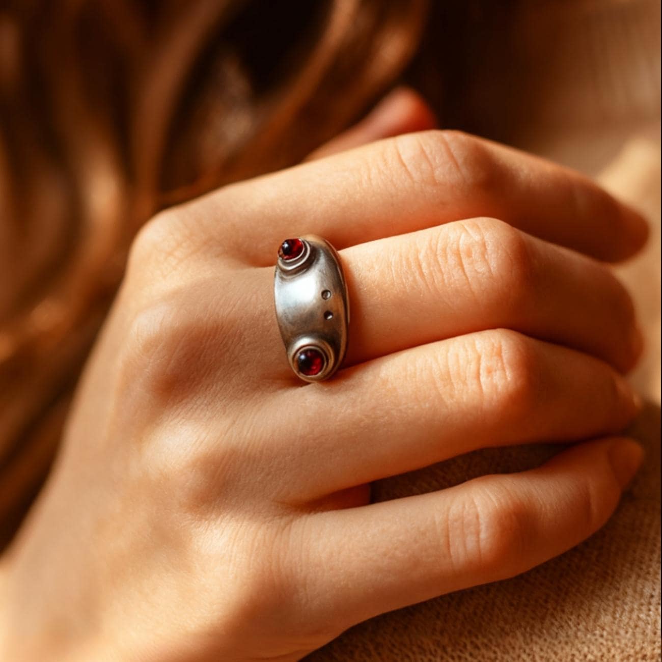 ✅Symbolischer doppelter Steinakzent: Die beiden dunklen Steine stehen für Harmonie, Ausgeglichenheit und Verbundenheit. Ihre tiefen Farbtöne sorgen für Kontrast und Tiefe, ohne die silberne Basis zu überwältigen. Diese subtile Symbolik macht den Ring zu mehr als nur einem Accessoire. Er wird zu einem stillen Ausdruck innerer Stärke und Einheit.