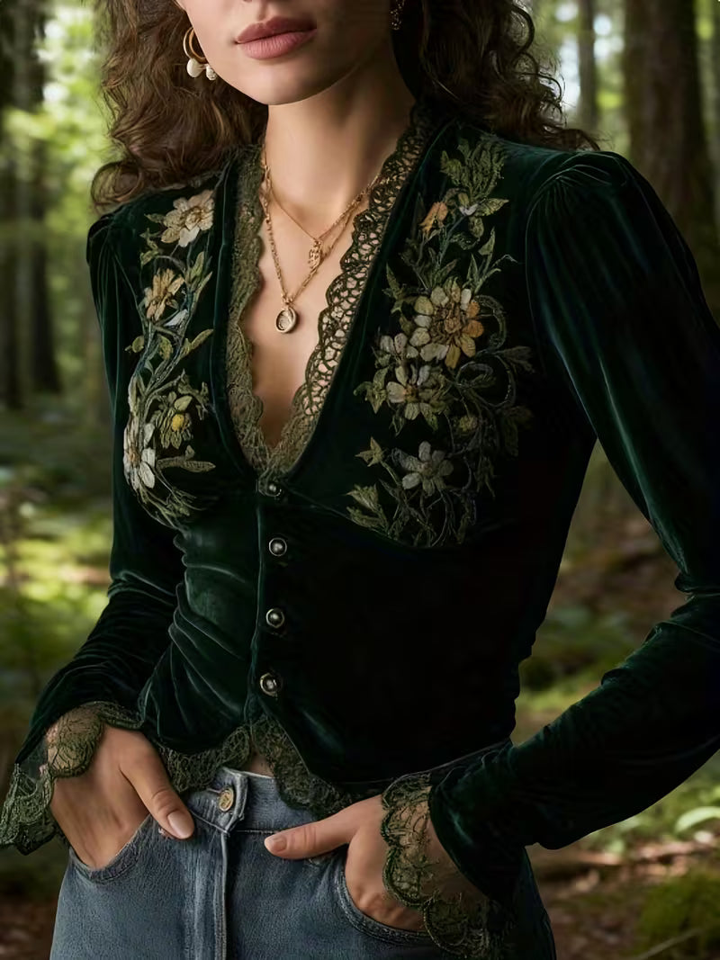 Nayelian – Langärmliges Samthemd mit Blumenstickerei