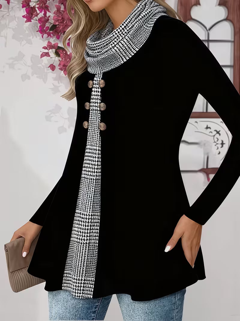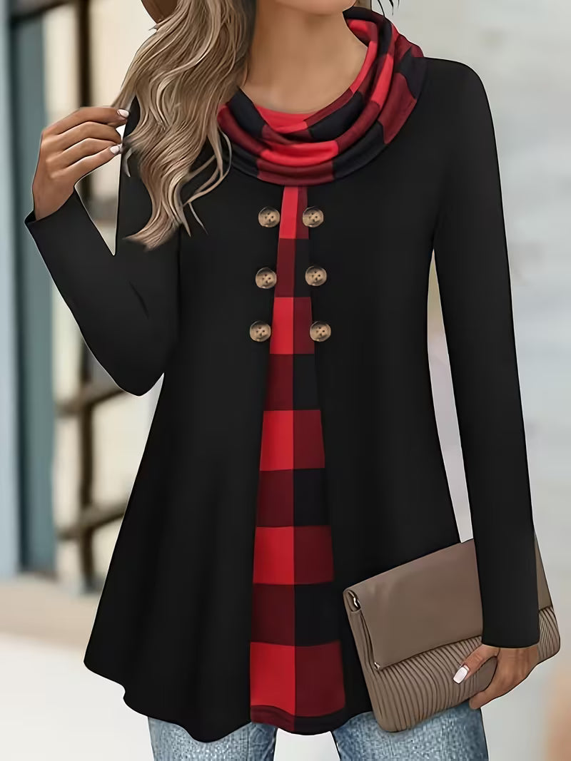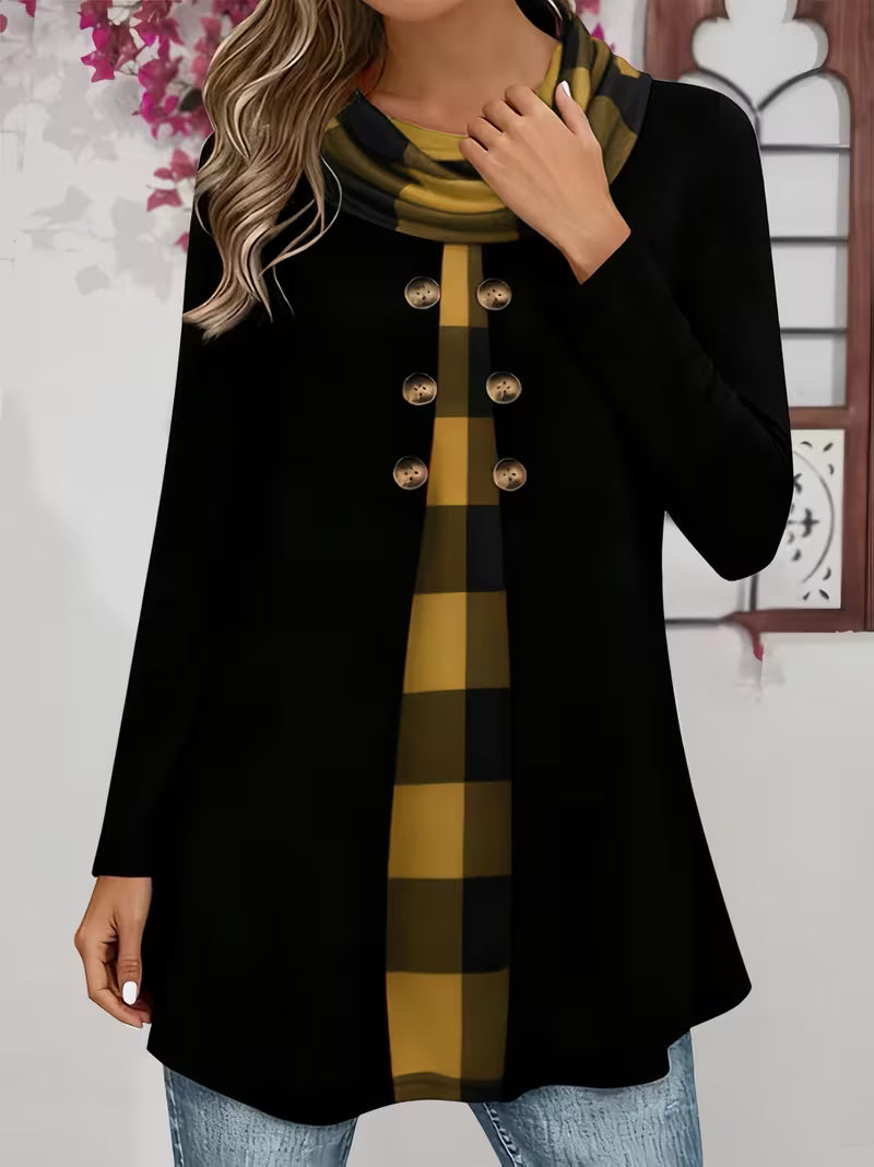 ✅Eleganter Zweiteiler-Schau: Das Sahar-T-hemd mit gerüschtem Kragen wurde so gestaltet, dass es wie ein Zweiteiler wirkt, und sorgt für sofortige Eleganz ohne zusätzliche Volumen. Der karierte Akzent und die dekorativen Knöpfe sorgen für einen raffinierten, stilvollen Schau und machen es perfekt für Frauen, die mühelose Eleganz mit alltäglichem Komfort verbinden möchten.