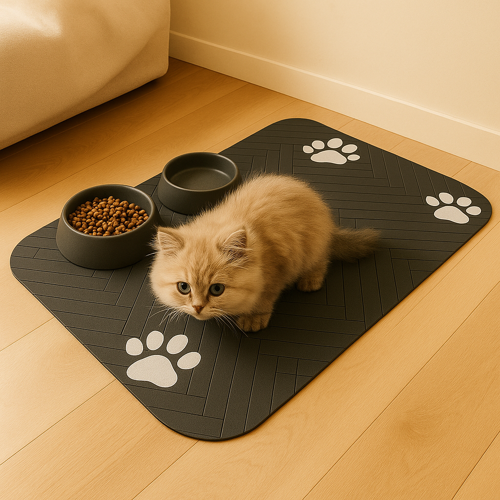 Mit niedlichen Pfotenabdrücken und neutralen Farben passt die Matte in jedes Zuhause. Das flache Design lässt sich leicht unter Näpfen platzieren, ohne viel Platz einzunehmen.